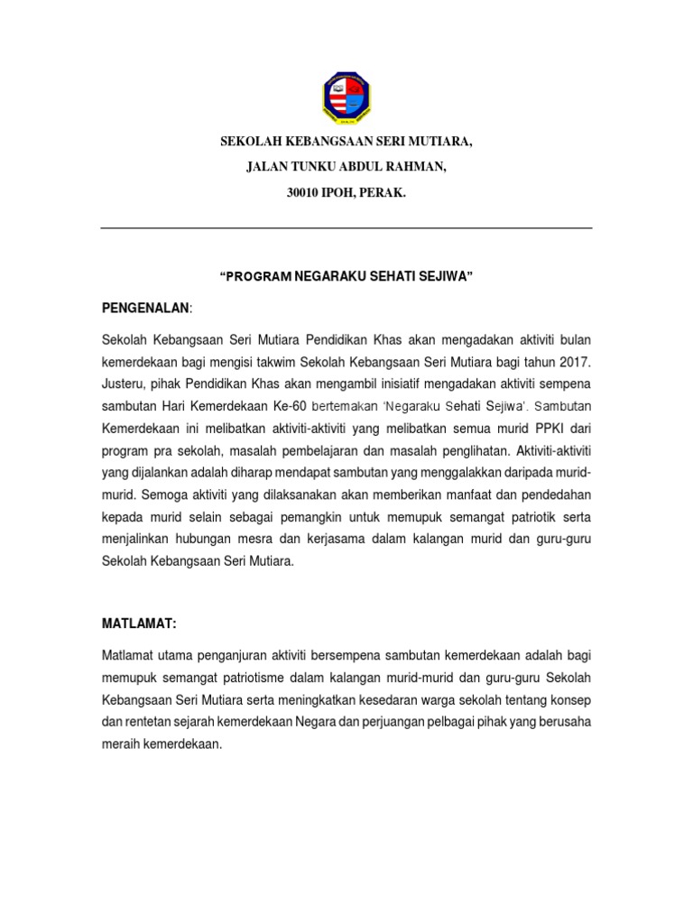 Panitia sivik dan kewarganegaraan panitia sejarah panitia. Sk meru 2 jalan paip. Dapatkan sayangi malaysiaku mewarna yang berguna dan boleh. Sekolah menengah kebangsaan pandan mewah ampang, selangor kertas kerja sambutan bulan kemerdekaan tahun 2016 anjuran: Download cepat himpunan contoh kertas kerja pertandingan mewarna yang. Unit pendidikan pencegahan dadah sk meru 2 tarikh: Bulan jabatan kemanusiaan pada tahun ini dijalankan pada bulan ogos yang juga merupakan bulan kemerdekaan. Kertas kerja dan bahan berkaitan sambutan kemerdekaan 2020 malaysia prihatin. Panitia pendidikan moral tahun 2019 kertas kerja aktiviti bulan jabatan kemanusiaan dan bulan kemerdekaan. Antara kertas kerja yang terdapat dalam koleksi ini seperti, kertas kerja kem bestari solat, kem cemerlang jawi, bulan kemerdekaan, hari keusahawanan, kertas kerja minggu bahasa dan banyak lagi. Semoga allah membantu rakyat indonesia agar semakin merdeka di tanah tumpah darah para leluhur yang memperjuangkan kemerdekaan kerja kita prestasi bangsa. Sejarah kemerdekaan indonesia lengkap (17 agustus 1945). Aktiviti dan kejayaan sk kelibang 2019.
