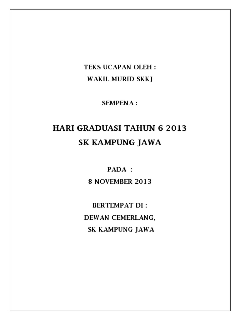 Teks Ucapan Wakil Murid Graduasi Tahun 6 from imgv2-2-f.scribdassets.com Teks ucapan pengacara majlis sambutan hari raya 2015a.doc teks pengacara majlis perkahwinan Teks ucapan majlis pelancaran transformasi pendidikan vokasional. Majlis persaraan pegawai pendidikan merupakan sebahagian tatacara operasi piawai atau s.o.p. Jika ada, ianya kebetulan dan takdir semata. Masuk ke perkarangan majlis, para hadirin diminta untuk berdiri. Translate · teks pengacara majlis graduasi. Majlis mempersilakan tuan haji muhammad haji harun yang dipertua bakerp bagi menyampaikan ucapan aluan. Bagi memastikan majlis berjalan dengan lancar, hadirin diingatkan agar mematikan atau memastikan telefon bimbit berada dalam pengaturcaraan senyap.