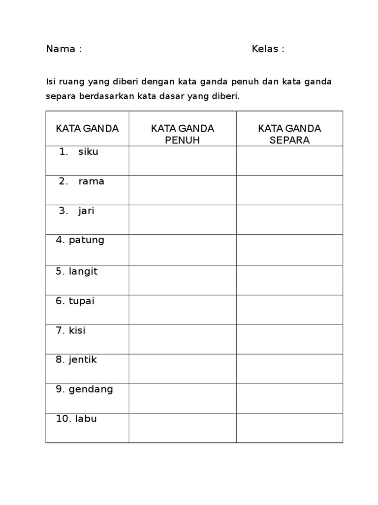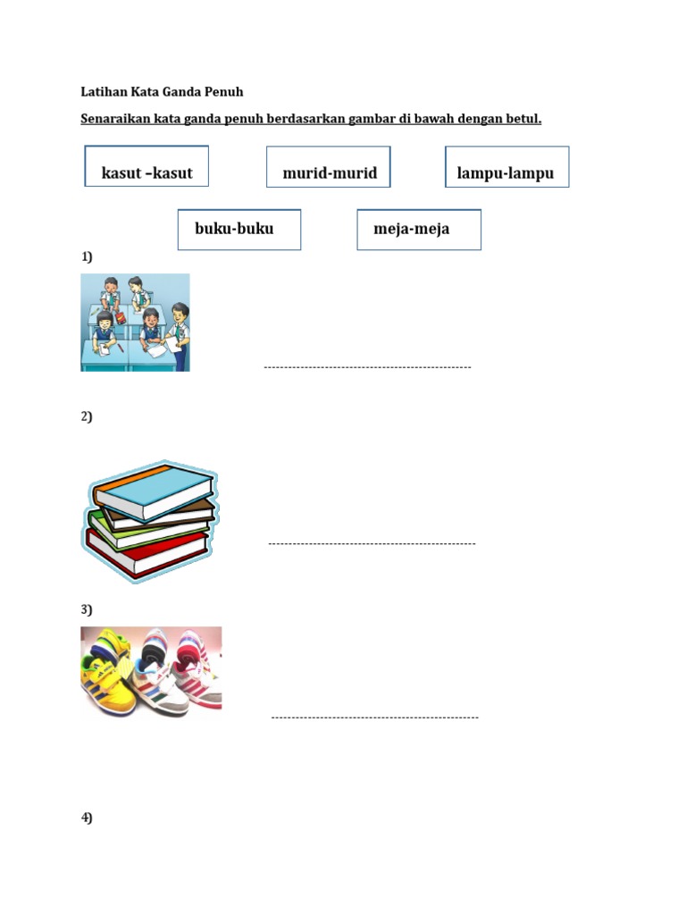 Kata ganda penuh atau penggandaan penuh bermaksud seluruh perkataan diulang tanpa mengalami perubahan bunyi atau bentuk, sama ada berimbuhan atau tidak. Isi tempat kosong dengan kata ganda yang paling sesuai. Bm 200 kata ganda with chinese meaning life long eduwebtv bahasa melayu kata ganda. Lengkapkan kata ganda penuh berikut. Penggandaan penuh kata tunggal terbahagi kepada 4 iaitu. Kata ganda by pkgsipitang flipsnack. Lembaran kerja mudah untuk topik kata ganda. Hal tersebut tentunya tidak akan mengurangi rasa cinta dan harapan doa untuk sahabat kamu. Kata ganda latihan 16 imbuhan awalan latihan 17 imbuhan akhiran latihan 18 sinonim latihan 19 antonim latihan 20 penjodoh bilangan. 1.kata ganda separa terbentuk apabila sebahagian daripada kata saja yang digandakan. Kata ganda online activity for tahun 4. Bebalai,bebarau,bebawang,bebenang, bebola,bebotok,bebuli,bebuluh, cecair,cecawi,cecekak,dedali,dedalu, dedamak,dedaru,dedawai 1) kata ganda yang diberi imbuhan. Contoh penggunaan kata ganda berimbuhan dalam ayat.